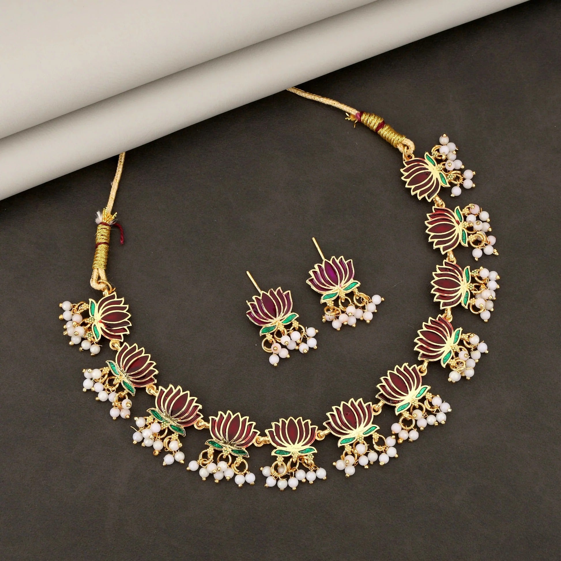Gold-Toned maroon-Green Enamel Lotus & Pearl Choker Set | Lightweight, Stylish